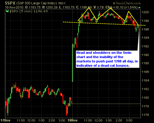 On the intraday charts, the picture is even clearer – you have a definite head and shoulders pattern that was confirmed on the five minute charts, and an attempt at the end of the day to rally back, but instead closed just below the neckline. And like the daily chart, the head and shoulders pattern coincides with the inability of the markets to break 1200.