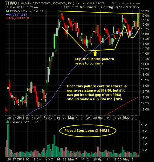 I’ve been busy this morning closing out a couple of positions, while monitoring a few other breakout plays (follow me on twitter to get them as I find them). So far no new positions, but I did close out my NFLX June 270 Calls at $4.10 from $2.44 resulting in a 68% gain on the premium and 9.1% gain on the underlying asset that I traded. Below are two very nice setups depending on which side of the trading aisle.