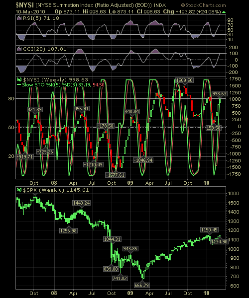 Basically, all I am using is a traditional NYSI – Advance/Decline on a weekly basis, and the market timer is the overlay of a stochastics of the NYSI indicator (middle chart below). Then below that you have the weekly on the S&P to show how the extremes on the NYSI stochs coincides with the S&P chart.