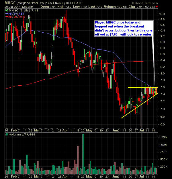 Quiet day in the market so far, and its not tanking (…yet) and is managing to hold on to yesterday’s gains (biggest day of the year for the Dow). I’ve made a number of trades, today, and overall I’m doing fine on the heals of the breakout we got in Hansen Medical (HNSN) today. By the way, for all my trades real-time and their entries, join me in the Chat-Room or Follow me on Twitter.