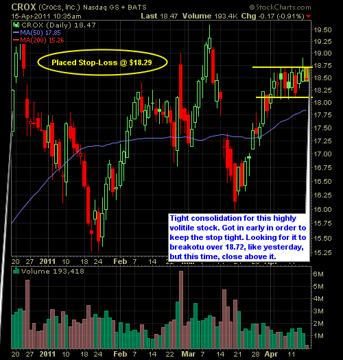 I closed out AMGN this morning at a 2.2% gain at $55.50. I also tightened my stop-loss in GLW to 19.66 to lock in my gains which is just below the day’s lows. My two new trades on the day are CROX and DISCK, which so far haven’t been very kind to me on the entries. We’ll see how they turnout but so far the breakout in DISCK has been a total joke.
