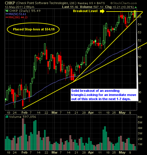 I finally pulled the trigger on two trades this afternoon. The first being in Check Point Software Technologies (CHKP) at $54.19 and the second one being in Constellation Brands (STZ), which was also listed as my daily long setup this morning. I’ll likely be dumping off a few other non-performing positions by the end of