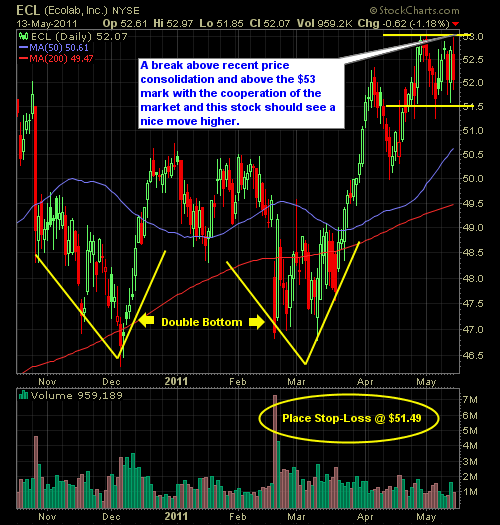 Futures are pointing down, at the moment, but a lot can change between now and the open. Either way, I’ve provided you below with 10 trading setups – 5 of which are to the long side and the other 5 are to the short side. Let’s make it a great week! LONG: Ecolab (ECL) LONG: