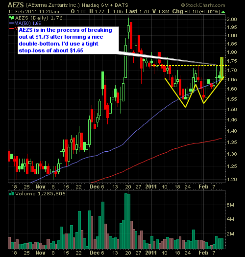 Looking through some low-dollar stocks this morning, I found three in particular that looked prime for the trade. I’m going to warn you though, these stocks move fast and furious, so you want to pay close attention to them, and use tight stop-losses.