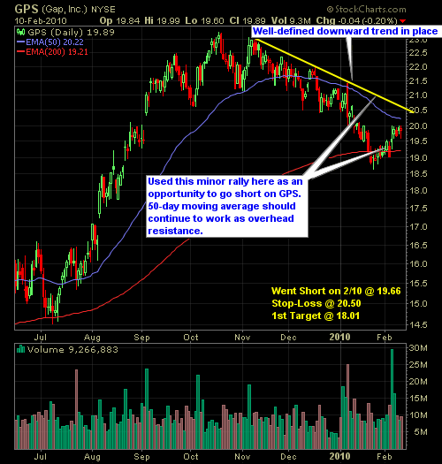 Today I finally jumped back into the market on the short side with two new positions in Gap (GPS) and Hilltop Holdings (HTH) – a clothing retailer and an insurance company respectively. The plan going forward is to gradually scale my portfolio into a good number of short positions, by adding a new position or two each day as conditions merit. There are still a great number of short setups still out there that I’d like to get in, but am choosing to be patient with in my entry into those stocks. ideally, I would have been better off had I waited until this afternoon to jump into these two new positions (hindsight 20/20); as it stands now I am down just a bit in each of these stocks.