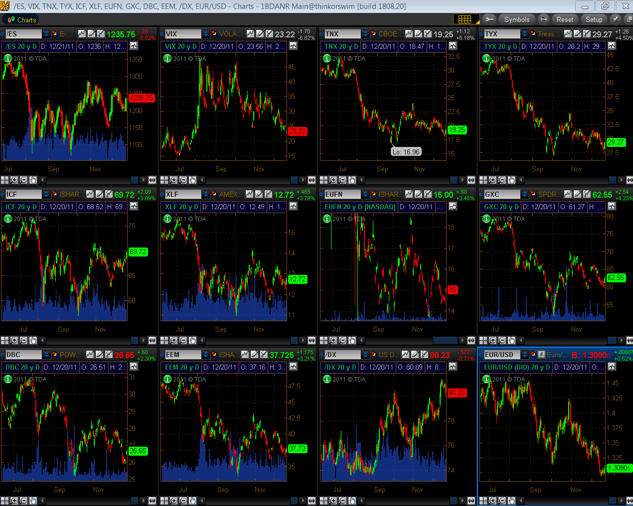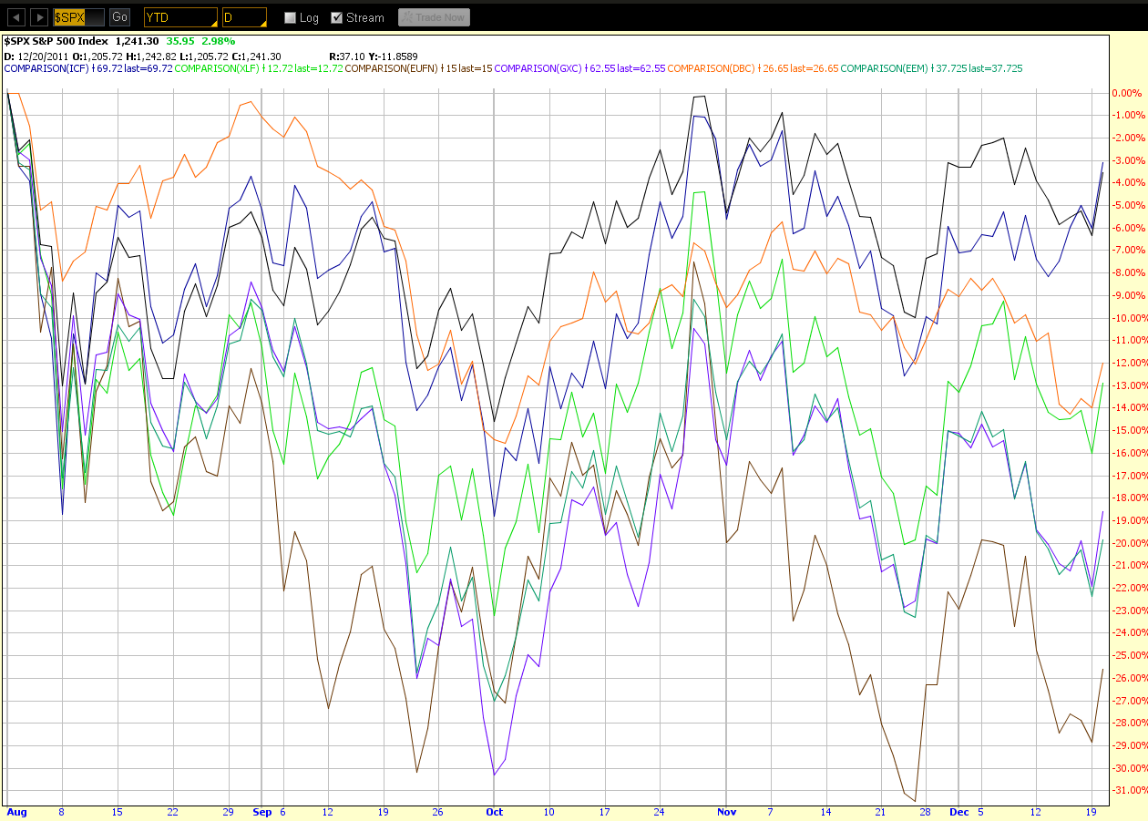 The Daily chartgrid below shows where price is on the ES in comparison with a number of other instruments since its drop in July of this year. The ES and ICF are showing relative strength from their September lows…XLF and DBC are running second…GXC and EEM are next…EUFN is next…TNX and TYX are next…and EUR/USD is last, which puts the U.S. $ in first place and ahead of the ES.