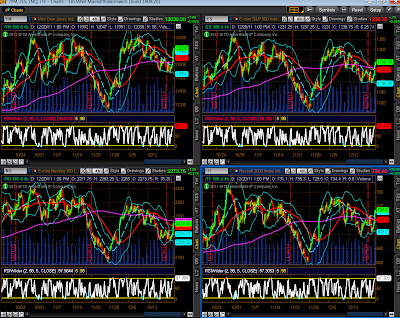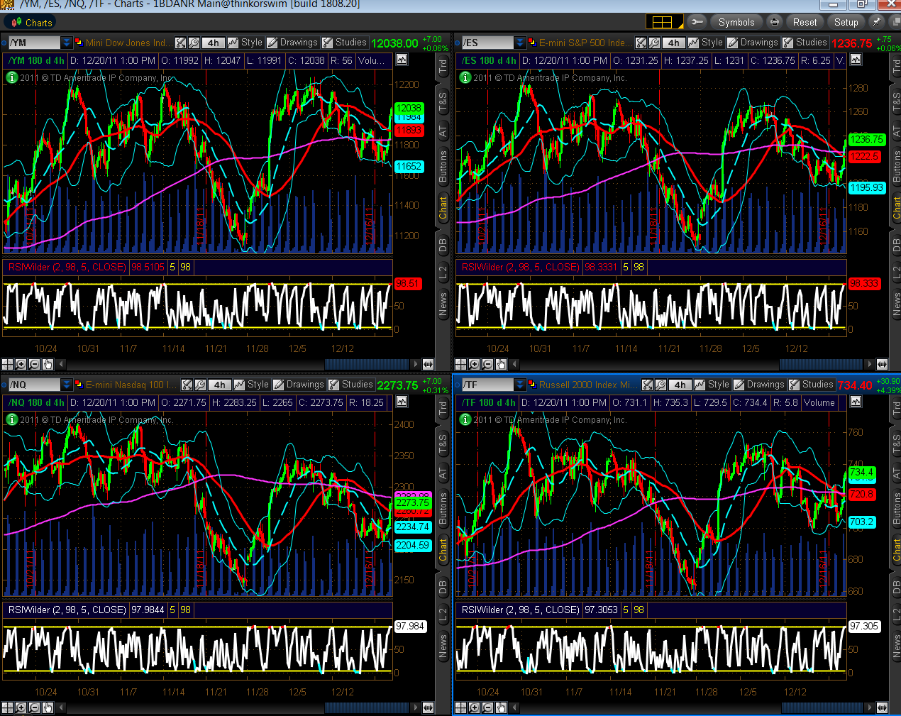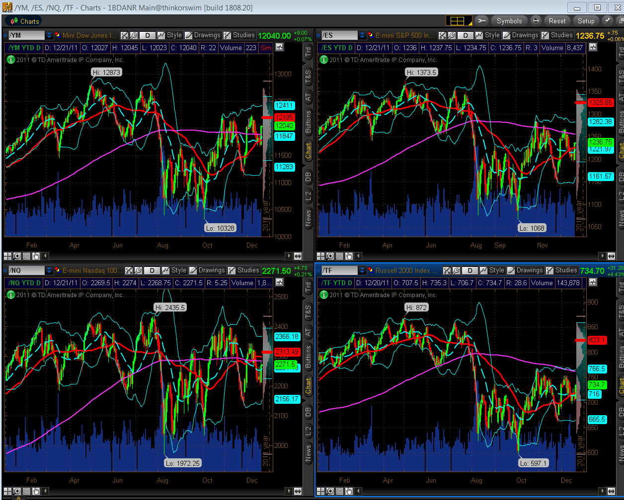 After today’s big rally, the YM, ES, NQ & TF may be headed towards their upper Bollinger Bands on the Daily chartgrid below. I seem to recall that Goldman Sachs’ 2011 year-end target for the ES is 1250…(and that their original target was 1400, which was then reduced to 1350…and so on)…that would take price roughly up to the 200 sma (pink) on the ES. That’s certainly a possibility if the upward momentum continues.
