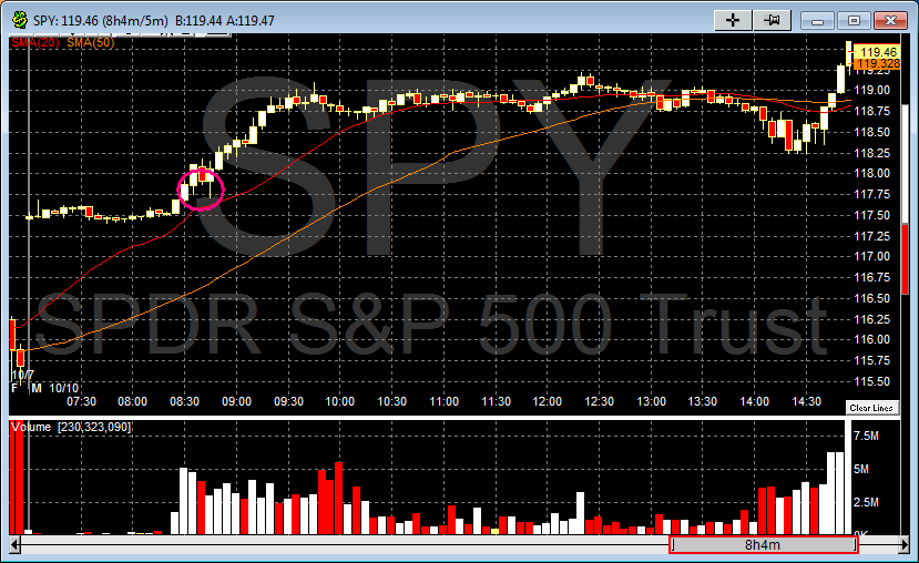 3. On the SPY (5min chart – pictured above) the purple circle marks our break through the 50 day moving average and the slight retest. As you can see the test of the 50 day moving average was quickly bought up and the market zoomed higher. If we come back to retest the 50 day moving average on the daily chart I believe it too will be bought up.