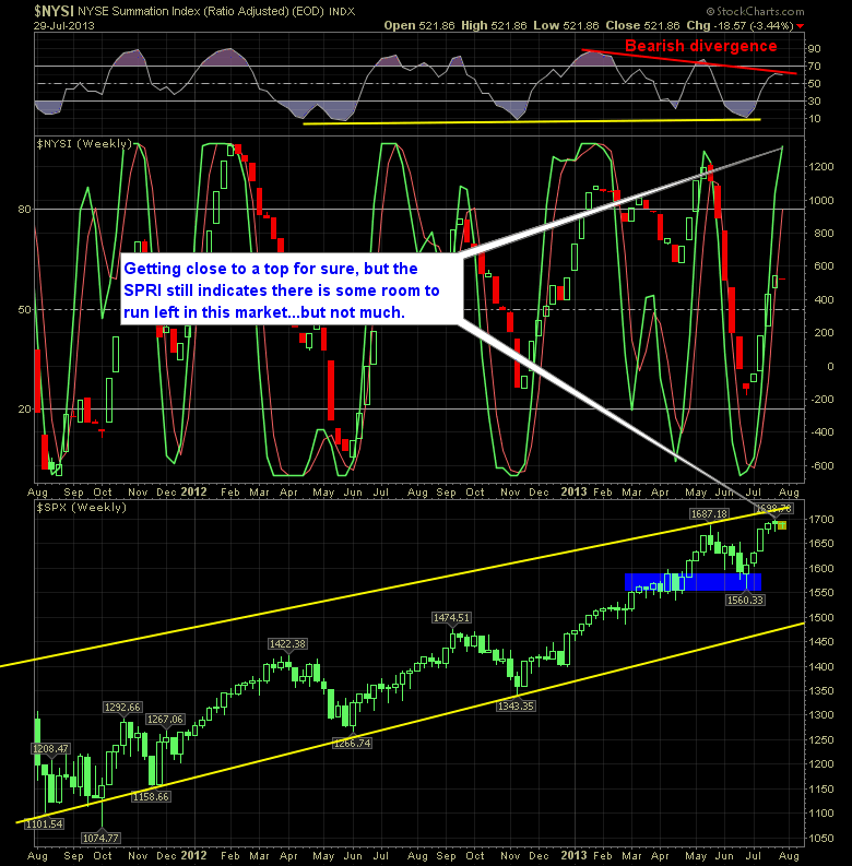 Then when you look at the weekly you can see that with the price action how the markets are starting to struggle some as it reaches indicator extremes. So the Daily could very well be right as a foreshadowing of things to come just around the corner.
