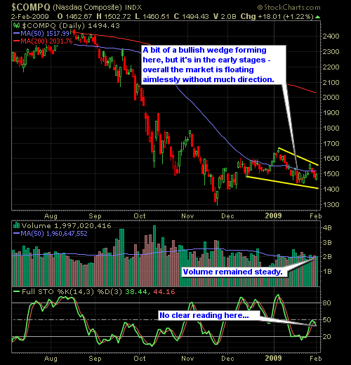 Looking at the daily charts of the Nasdaq and S&P, there is no real indication where the markets are trying to take us. While we have come off of our lows, it is not by much, but the consolidation could be a sign that the bulls are attempting to put together another run. But let’s face it, the last descent run that the markets had was back in late December, and it was pathetic at best.