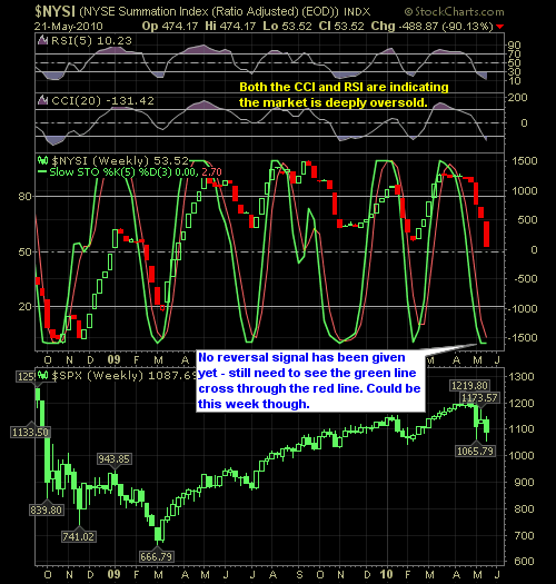 The second chart is that of the NYSI Advance/Decline with a Stochastics overlay included. This is one of my favorite indicators for determining market reversals, and while it is at the bottom, it hasn’t reversed yet, but could see it do so as early as next week.