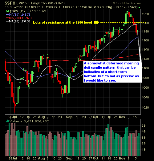 Big day in the market today, but there is a number of questions in my mind that looms, casting doubt on the legitimacy of today’s rally, both from a daily perspective and an intraday perspective. On the daily charts, you’ll see that we failed to recapture the psychological 1200 mark that the markets need to