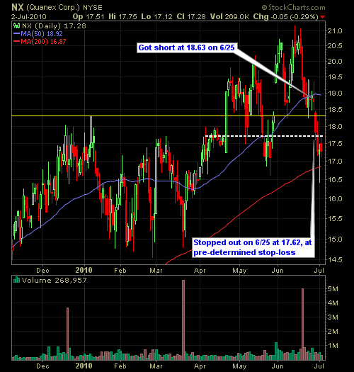 Not every trade goes according to one’s wishes, but every trade can go according to the plan! How is that? Well let me explain. On 6/25 I had recommended going long in Quanex (NX) with a stop-loss at 17.62. The chart itself was phenomenal. I was short in every other stock I had in