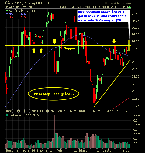Another two tech plays added to the portfolio (continue to hold RAX and GOOG), in Analog Devices (ADI) at $39.74 and CA Inc. (CA) at $24.36. I’ll be looking to close out my position in Discovery Communications (DISCK) by the market close today. LONG: CA Inc. (CA)