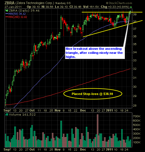 This was one of my trades from late yesterday, but still valid today, after having covered all of my short positions. It has an ideal chart pattern with the ascending triangle and is now breaking out above resistance. Stop-loss is tight at $38.10. Here is the chart analysis for ZBRA.