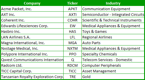 This is by far, one of my favorite stocks screens that I run. I have probably found more winning stocks (and big % ones at that) off of this screen, than any other one that I run. In fact, TICC, mentioned below, is one that appeared on this screen about two months ago, and I