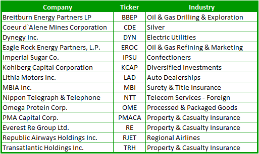 This is by far, one of my favorite stocks screens that I run. I have probably found more winning stocks (and big % ones at that) off of this screen, than any other one that I run. In fact, TICC, mentioned below, is one that appeared on this screen about a month ago, and I
