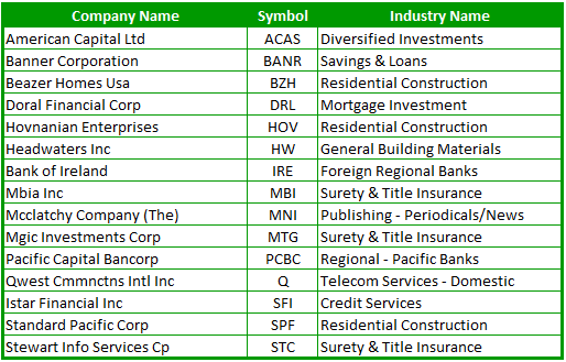 Below are the screen results of stocks that have a book value per share that is more than its price per share. Like last time, I just want stocks selling at a THIRD of their book value. Before it was half – so the parameters are tightening. Also, I wanted only those stocks that are