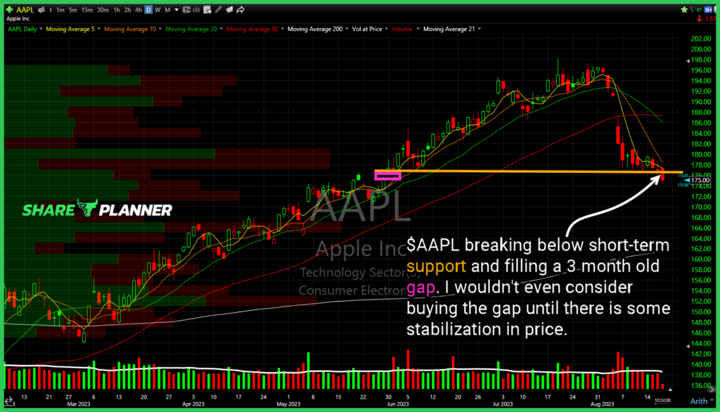 $AAPL breaking below short-term support and filling a 3 month old gap. I wouldn’t even consider buying the gap until there is some stabilization in price.