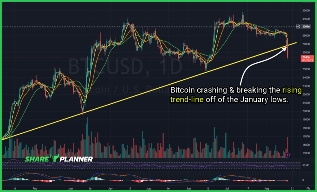 Bitcoin $BTC.X crashing & breaking the rising trend-line off of the January lows.
