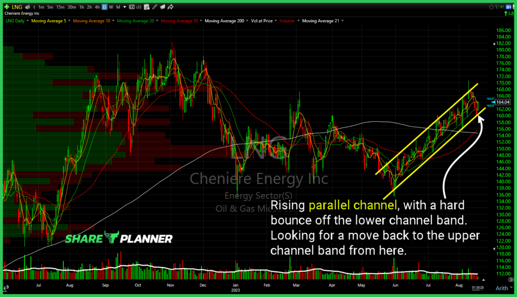 $LNG Rising parallel channel, with a hard bounce off the lower channel band. Looking for a move back to the upper channel band from here.