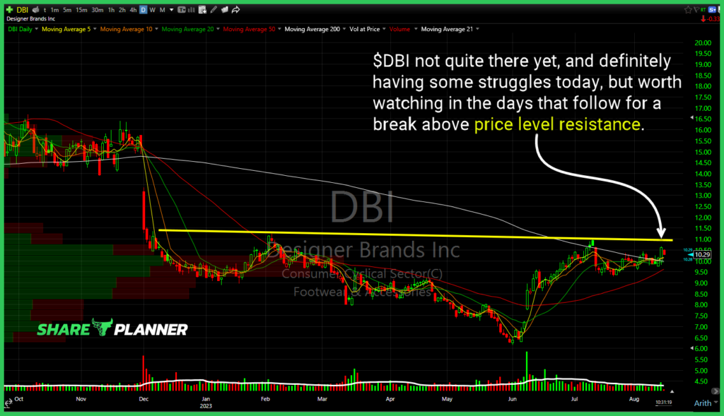 $DBI not quite there yet, and definitely having some struggles today, but worth watching in the days that follow for a break above price level resistance.