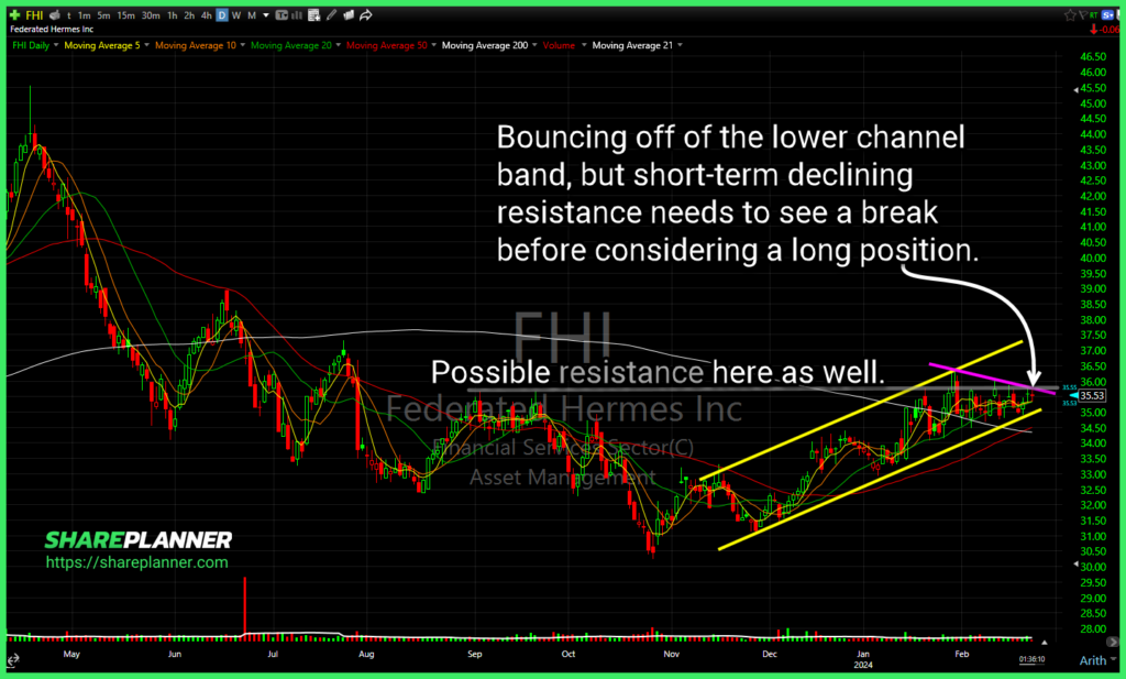 $FHI bouncing off of the lower channel band, but short-term declining resistance needs to see a break before considering a long position.