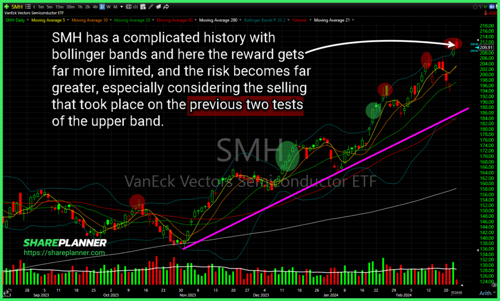 $SMH has a complicated history with bollinger bands and here the reward gets far more limited, and the risk becomes far greater, especially considering the selling that took place on the previous two tests of the upper band.
