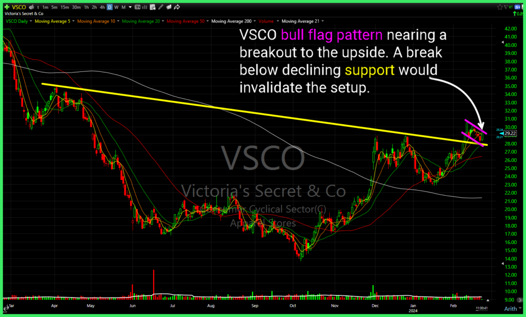 $VSCO bull flag pattern nearing a breakout to the upside. A break below declining support would invalidate the setup.