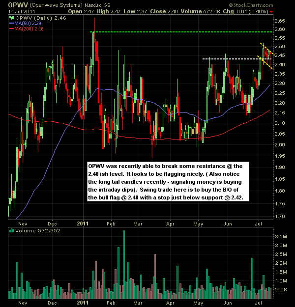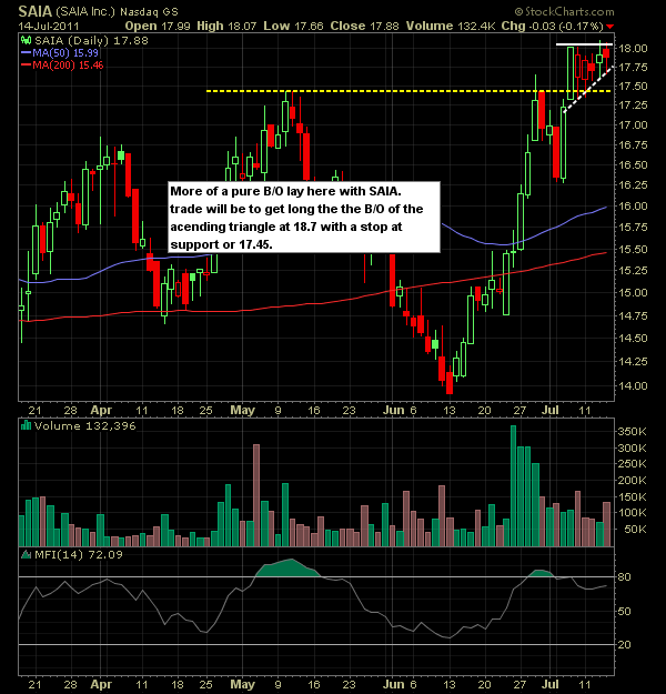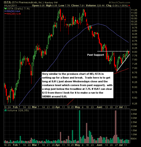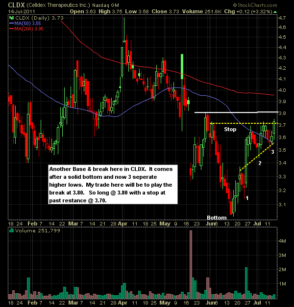 Here is set-ups and list of stocks I will be watching/trading today. After recent weakness due to all the uncertainty surrounding Euro Debt and the bickering about the US debt ceiling, GOOG came in with a solid quarter which should help to raise optimism for earnings season going forward.