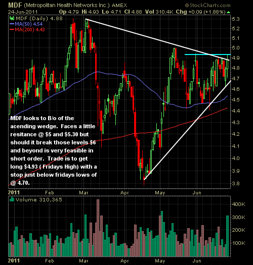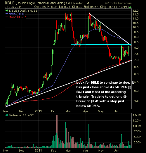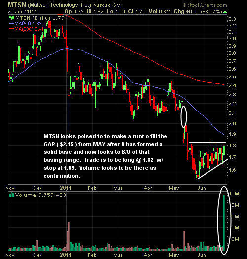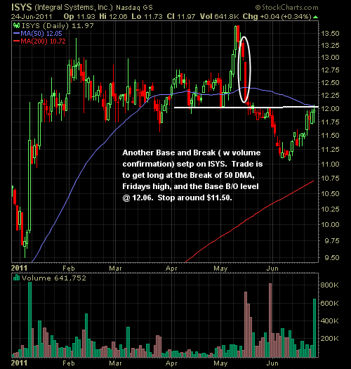 With some of my indicator pointing toward a relief rally, from our current oversold conditions, in the near future, here are the stocks I am watching going into the trading session this morning. ( 6-27-2011) A few different type of set-ups are included. Some are base and B/O ( breakout) while others look B/O to new highs. These set-ups can be traded as day-trades or swing trades depending on your risk tolerance.