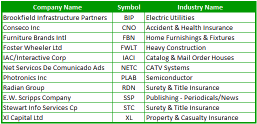 Below is a list of 11 potential takeover targets based on value and the ability to acquire the company. I didn’t put a limit on the size of the company, so there are some ‘Gigantors’ in the list below, but nothing like a Wal-Mart or Microsoft or anything close to it. All of the companies are acquirable and have solid financials that would make them a luring target for some bigger fish in the sea. Not everyone of these will be taken over, but the point is to get you started on finding some gem of an idea that could lead to it. Who knows? Maybe your best trade of the year lies somewhere in the list below!