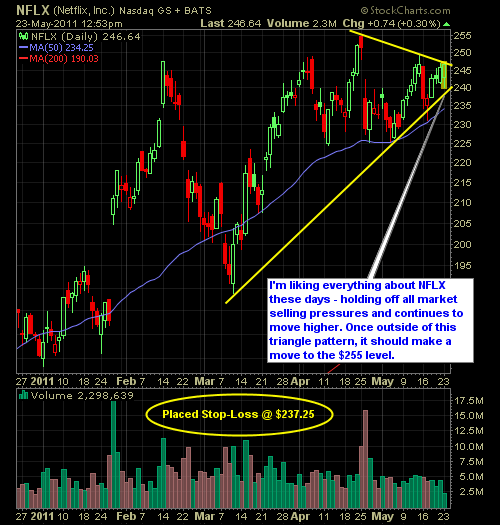 I was a bit hesitant to go long on anything this morning, but finally decided to pull the trigger on Netflix (NFLX) because a) does much better than the field in bear markets b) bouncing off a nice intermediate upward trend-line c) looking to break through resistance above. I also got into SSO on