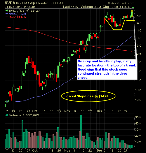 After finally seeing some signs of life from this market, I decided to go long on NVDA at $15.28. My stop is pretty tight, at $14.78. The setup is no doubt appealing and one worth jumping on with the cup and handle in play and could easily see a move into the $16’s in